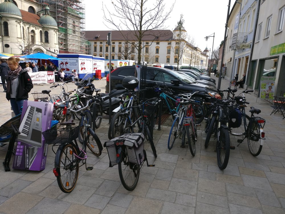 In einer Mitteilung an Markus Wiedemann, Leiter des Amtes für Tiefbau und Verkehr der Stadt Kempten, bittet Thomas Hartmann, Vorsitzender der grünen Stadtratsfraktion, erneut um die Ausweisung eines kleinen Teils der PKW-Stellplätze am Hildegardsplatz an Markttagen für das Abstellen von Fahrrädern. Pro Pkw-Stellplatz können 8 bis 10 Fahrräder untergebracht werden. Thomas Hartmann hatte diese Bitte bereits im letzten Jahr ausgesprochen; es sei jedoch bisher nichts geschehen, was aktuell erneut zu Verhältnissen wie auf dem Foto führt. "Das ist für FahrradfahrerInnen nicht einladend und kann verbessert werden", schreibt er.