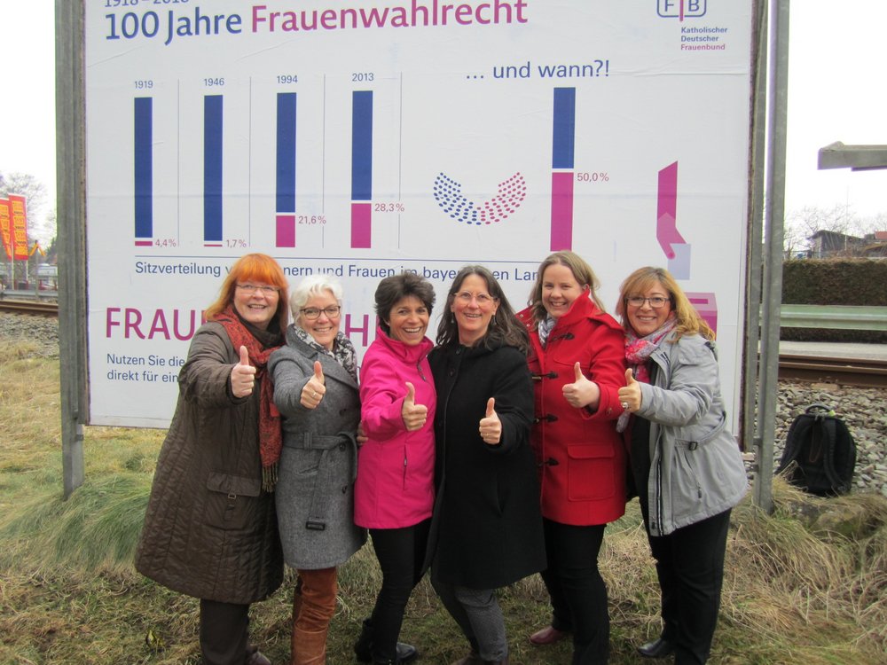Die Kemptener Stadträtinnen aller Fraktionen unterstützen den Aufruf vom Katholischen Frauenbund Augsburg: mehr Frauen in die Parlamente. Obwohl das Frauenwahlrecht sich heuer bereits zum 100. Male jährt, ist doch von einer gleichen Vertretung von Frauen im Landtag und auch den kommunalen Parlamenten keine Rede. Das muss sich ändern, meinen die Kemptenerinnen und stellten sich am 6.3. 2018 kurzerhand vor das Plakat des KdF um dieser Forderung Nachdruck zu verleihen.