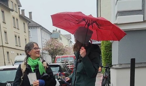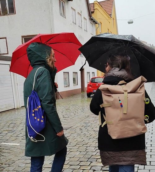 Eva Lettenbauer und Barbara Haaggenmüller haben sich nicht vom schlechten Wetter abhalten lassen und in Kempten den Haustürwahlkampf eröffnet.