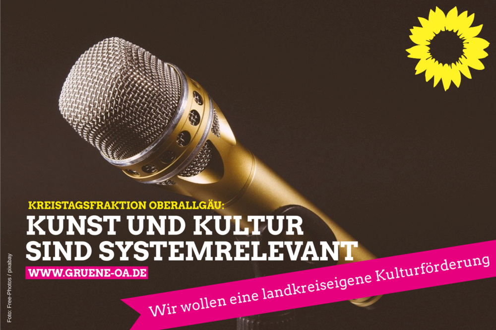 Corona verlangt den Menschen und der Kultur seit einem Jahr viel ab. Auch 2021 wird das Zeitfenster sehr klein sein, in dem Kultur veranstaltet werden kann. Die berufliche Situation der professionell Kulturschaffenden im Oberallgäu ist existenzbedrohend. Unter den aktuellen Bedingungen leidet die gesamte Veranstaltungsbranche, auch hier geht es um Einkommen und damit um Existenzen. Außerdem gibt es für Laienkünstler sowie die traditionelle Kultur im Allgäu wenig Möglichkeit, sich darzustellen. „Wir brauchen Kunst und Kultur für den Erhalt einer solidarischen, offenen und empathischen Gesellschaft. Die zahlreichen Künstler*innen im Oberallgäu haben eine wichtige Funktion im öffentlichen Leben. Auch Kultur ist systemrelevant“, begründet die Fraktionsvorsitzende Christina Mader den Vorstoß der Grünen, endlich die Kulturschaffenden im Oberallgäu zu unterstützen. Im Sozialausschuss, unter dessen Dach auch die Kultur fällt, hat die Kreistagsfraktion von Bündnis 90/DIE GRÜNEN einen Antrag eingereicht, in dem die Kultur auf drei Weisen gefördert werden soll. Im ersten Teil sollen Soforthilfen in Form von finanziellen Förderungen zur Anmietung von Räumen und der Umsetzung von laufenden Projekten für professionell Kunstschaffende eingerichtet werden – in Anlehnung an das Kulturförderprogramm der Stadt Kempten, die 150.000 Euro dafür bereitstellt. Parallel dazu soll ein eigenes Kultur-Videomagazins des Landkreises eingerichtet werden, in dem sich viermal im Jahr verschiedene Künstler aus allen Bereichen an wechselnden Veranstaltungsorten darstellen können. „Hierfür haben wir Kosten im Jahr von 14.000 Euro vorgesehen und ein fertiges Konzept miteingereicht, das die Zuschauer begeistern wird“, berichtet Bezirks- und Kreisrätin Christine Rietzler, die das Videomagazin gemeinsam mit Künstler*innen und Kulturschaffenden entwickelt hat.
