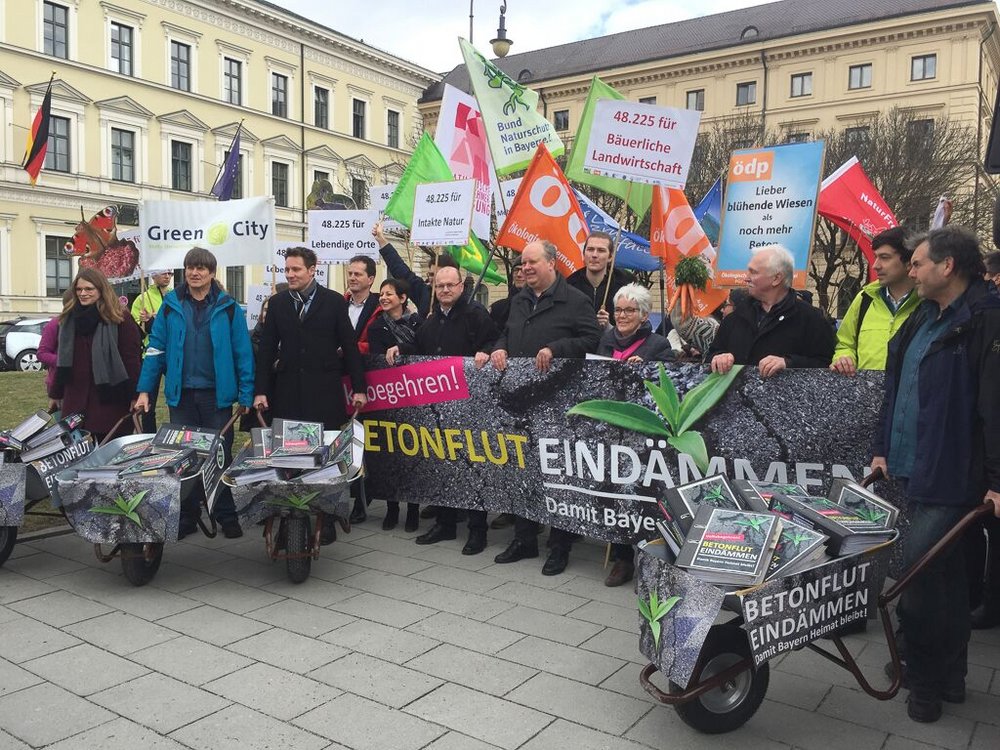"Die erste Hürde zum Volksbegehren ist genommen: 48.225 Unterschriften wurden am Mittwoch vom Bündnis „Betonflut eindämmen“ an das Innenministerium übergeben. So viele, wie bei keinem anderen Volksbegehren in der jüngsten bayerischen Geschichte. Mit ihren Fahnen und Transparenten stellten sich die Aktiven der vielen Unterstützerverbände symbolisch einem Bagger vor dem Innenministerium entgegen, um die bayerische Heimat zu schützen. Begleitet von Pauken und Trompeten betonten die Bündnisvertreterinnen und -vertreter vor der Übergabe die Dringlichkeit, endlich eine verbindliche gesetzliche Höchstgrenze für den Flächenverbrauch zu schaffen. Bündnissprecher Ludwig Hartmann bedankte sich stellvertretend bei allen Unterzeichnenden: „Gemeinsam haben wir dieses wichtige Volksbegehren über die erste Hürde gehoben. Knapp 50.000 gültige Unterschriften sind ein starkes Signal, wie wichtig den Menschen in Bayern der Schutz unserer Natur und Kulturlandschaft – unserer Heimat – ist. Bayern droht sein Gesicht zu verlieren. Die klare Begrenzung des Flächenverbrauchs ist die einzige Möglichkeit, die Betonflut wirksam einzudämmen.“