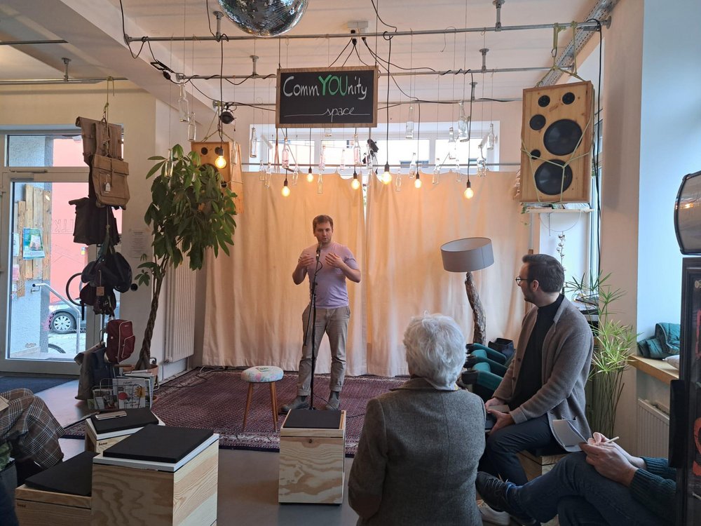 Max Retzer, grüner Kandidat für das Europaparlament, und die beiden PoetrySlamer Ivica Mijailovic und Nida zeigten am 25.04.24 im Piepmatz ihren Idealismus für ein friedliches und demokratisches Miteinander in Europa.