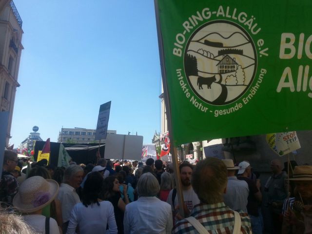 Der Bahnsteig in Kempten war bereits am Morgen gut gefüllt mit bunten Grüppchen von Demonstranten, die ausgerüstet mit Transparenten und selbstgeschriebenen Tafeln, Rucksäcken und Sonnenhüten in den Alex stiegen.