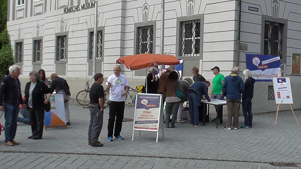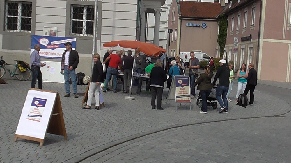 Am landesweiten Sammeltag für das Volksbegehren gegen das Freihandelsabkommen CETA hat sich auch das bunte Bündnis Oberallgäu - Kempten beteiligt und dies mit großem Erfolg. An den Unterschriftenständen sind teils Warteschlangen entstanden .So das die gemeinsame Aktion im OA und KE gemeinsam ca. 1100 Unterschriften (kein Schreibfehler Eintausendeinhundert ) und damit fast 5 % der notwendigen Unterschriften für Bayern brachte.