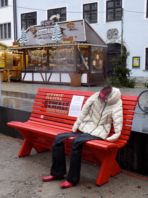 Die „Rote Bank“ wurde Anfang Oktober öffentlich in Kempten eingeführt. Nun wird sie im Stadtgebiet wandern und Platz in der Mitte des gesellschaftlichen Lebens nehmen. An jeder neuen Station wird eine andere Frau Platz nehmen, bzw. deren Kleidungsstücke. Die Schauplätze für Gewalt an Frauen sind vielfältig, Gewalt kann jede Frau betreffen, unabhängig von Alter, Bildungsstand, sozialem Umfeld, etc. Weitere Informationen: www.kempten.de/gegen-Gewalt