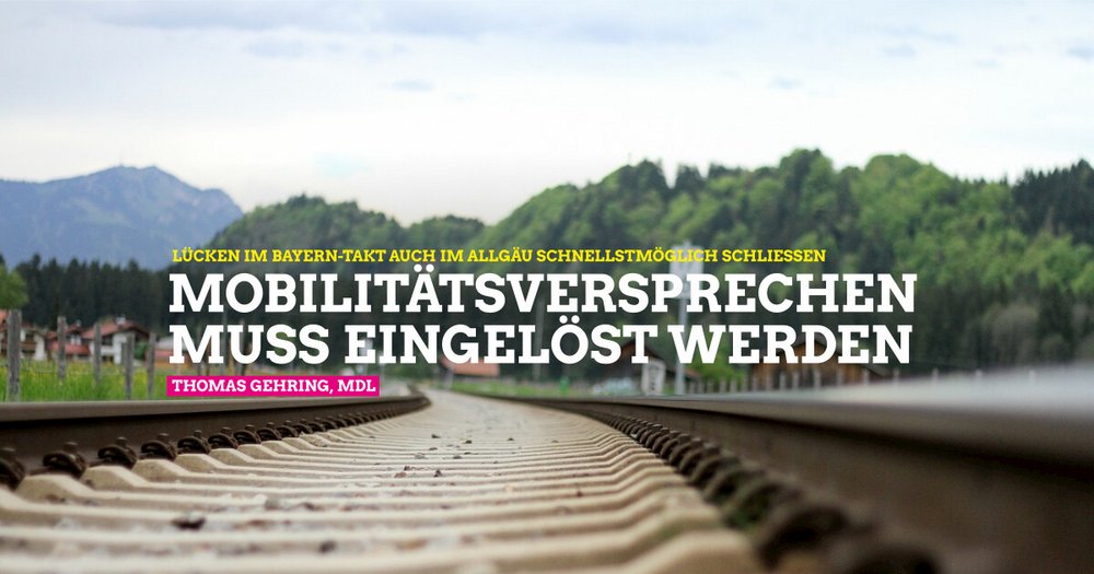„Als Grüne Landtagsfraktion werden wir hier weiter darauf drängen, dass die CSU-FW-Regierung ihr Bayern-Takt-Versprechen auch bei uns im Allgäu einlöst.“ Zugleich fordert Thomas Gehring die politischen Entscheidungsträger aus der Region auf, „unabhängig von der Parteizugehörigkeit für eine zügige Eintaktung der Strecken Ulm – Memmingen – Kempten sowie Kempten – Pfronten in den Bayern-Takt zu kämpfen“.
