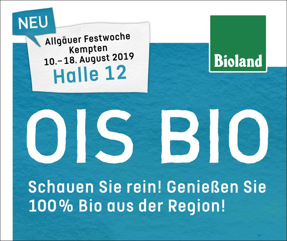 Wie uns Günter Räder (Grüner Kreisverband Ostallgäu; Bioland Bayern) mitteilte, wird es in Halle 12 auf der Allgäuer Festwoche unter der Regie von Bioland Bayern und der Öko-Modellregion Oberallgäu Kempten erstmals nur um ökologisch erzeugte regionale Lebensmittel gehen. Infostände, u.a. von "Fridays for Future", runden die Biohalle ab.