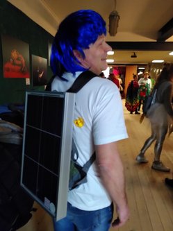 Eine einladende, sympathisch winkende, sprechende PV-Anlage (Robby Wirth) heißt uns am Eingang willkommen, genauso wie ein lachendes Windrad (Sebastian Riedel). Großartig.