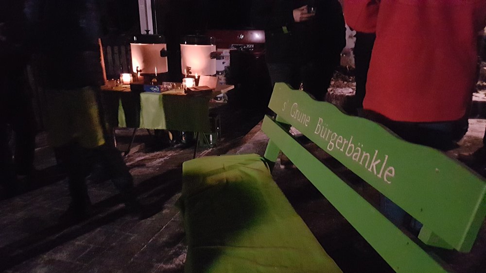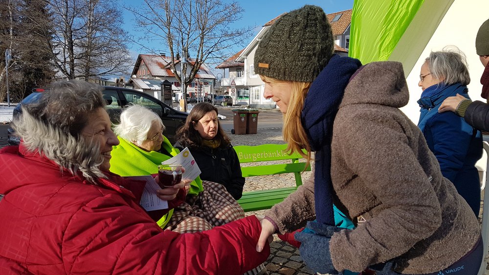 Buchenberg – Mit den Bürger*innen ins Gespräch kommen und bei einem Glas warmen Glühwein oder Punsch gemütlich beisammen sein – das war das Ziel der Einladung zu vier Veranstaltungen der Buchenberger Grünen. Die Kandidat*innen von Bündnis 90/ Die Grünen für die Gemeinderats- und Kreistagswahl brachten zu den Treffen ihr Grünes Bürgerbänkle mit. Immer mit warmer Decke, damit es beim Plaudern nicht kalt werden konnte. Die Veranstaltungen kamen bei den Bürger*innen gut an, viele nutzten die Gelegenheit, die Buchenberger Kandidat*innen kennen zu lernen und sich mit ihnen auszutauschen.