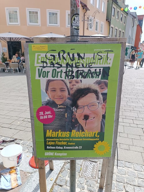 Wir ihr alle bemerkt habt, sind wir sichtbar in der Innenstadt mit unseren Plakaten vertreten. Wir erregen Aufmerksamkeit und Widerstand! Unschöne Beschmierungen und demokratiefeindliche Aufkleber bringen uns nicht aus der Ruhe! Wir zeigen konsequent bei der Polizei an, überkleben und machen weiter! Derzeit arbeiten wir an einer humorvollen Antwort auf die Beschädigung unserer Plakate. Lasst Euch überraschen und kämpft mit uns für die besten Ideen des Landes! Wir stellen uns den großen Herausforderungen unserer Zeit und ducken uns nicht weg!