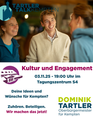 Der TartlerTalk ist ein politisches Beteiligungsformat, in dem Dominik Tartler - überparteilicher OB-Kandidat für Kempten - mit Expertinnen und Experten sowie interessierten Bürgerinnen und Bürgern in den Austausch geht. An fünf Abenden von Oktober bis Dezember soll es darum gehen, wie Kempten noch lebenswerter werden kann, welche Maßnahmen sich in anderen Städten erwiesen haben und welche Anliegen an die Kommunalpolitik herangetragen werden.