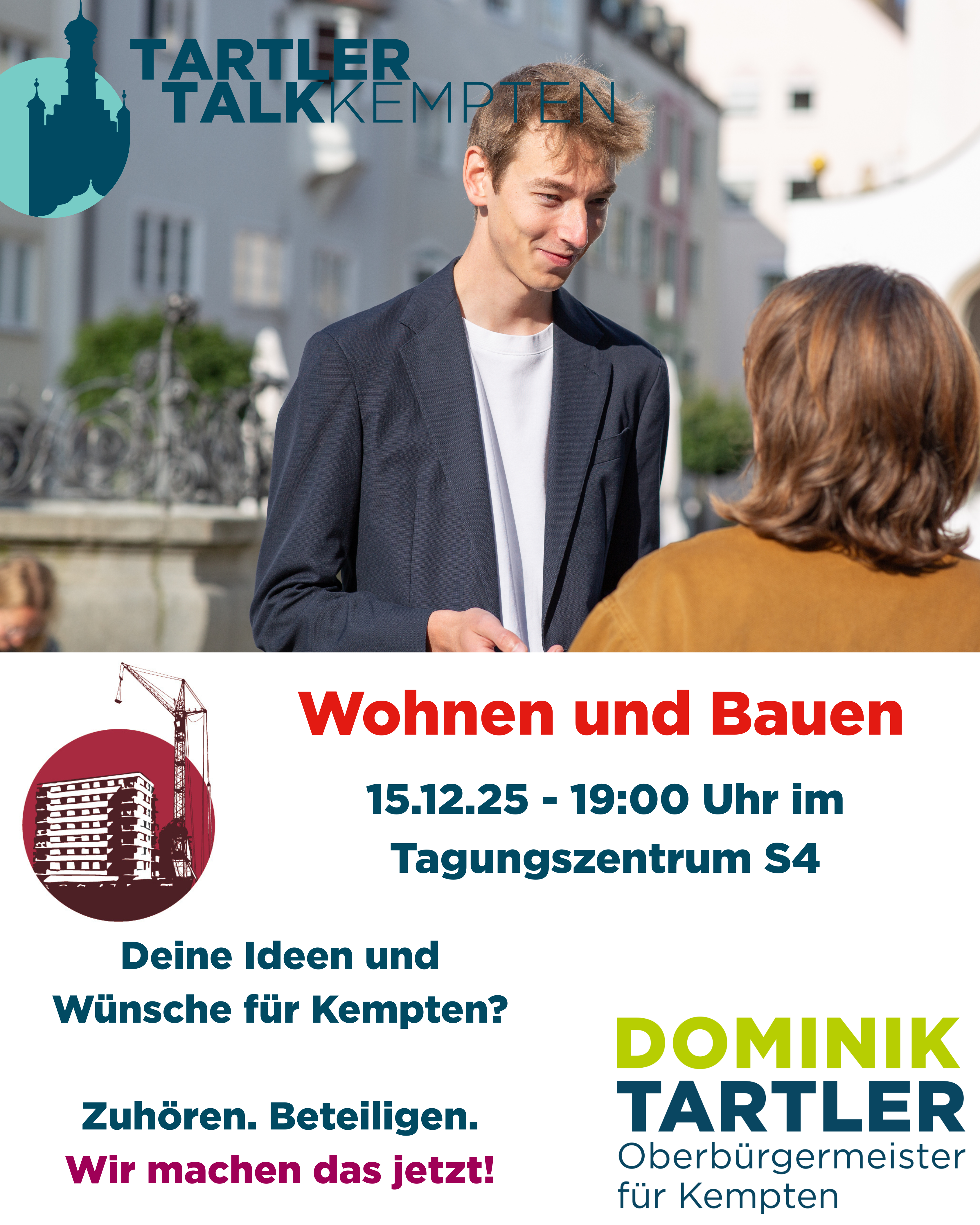 Der TartlerTalk ist ein politisches Beteiligungsformat, in dem Dominik Tartler - überparteilicher OB-Kandidat für Kempten - mit Expertinnen und Experten sowie interessierten Bürgerinnen und Bürgern in den Austausch geht. An fünf Abenden von Oktober bis Dezember soll es darum gehen, wie Kempten noch lebenswerter werden kann, welche Maßnahmen sich in anderen Städten erwiesen haben und welche Anliegen an die Kommunalpolitik herangetragen werden.